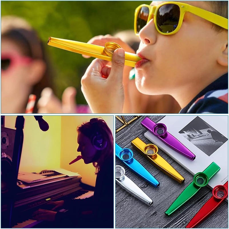 1. Our kazoo set is colourful, clear and melodious in music and easy to use. Preferred by children and adults. Metal kazoos musical instruments produce the most delicate sound when you burn in. Very easy to play, also for children, no need to practice.