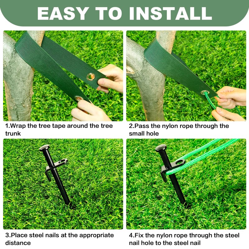 - Stable Tree Stake Kit: Our stumps are made of strong metal and can be driven into the ground well, strong and reliable, strong nylon rope it provides strong support for your small tree. Wide nylon tree straps are better than ropes or wire ties and can be used directly on the tree without worrying about friction or limiting growth.The soft, rounded edges of this arbor tie will not cut or damage bark