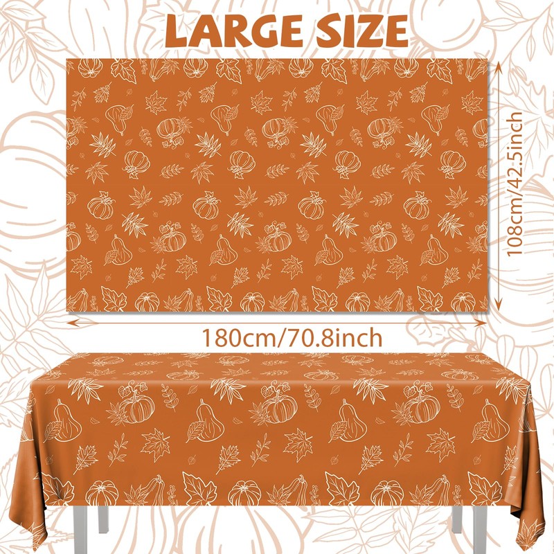 - FALL PLASTIC TABLECLOTH:Are you looking for thanksgiving table clothes?You will get 3PCS rectangular pumpkin table cloths.The size of each tablecloth for fall is about 70.8X42.5 inches, and the quantity size is enough to meet your harvest fall pumpkin party theme decorations and replacement needs