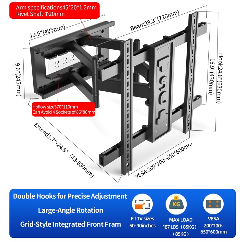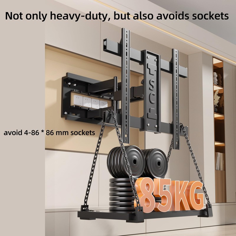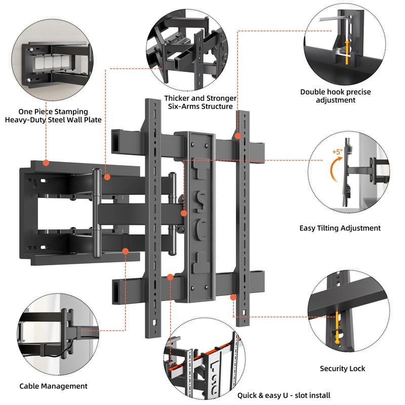- Tough and Durable: The 6 articulated arms of the TV stand are made of cold-rolled steel, and the fully enclosed one-piece front frame is more immutable,In addition, the integrated stamping wall panel can avoid 4 sockets sized 86*86mm,Can be installed in a Living Room Bedroom Kitchen and Office