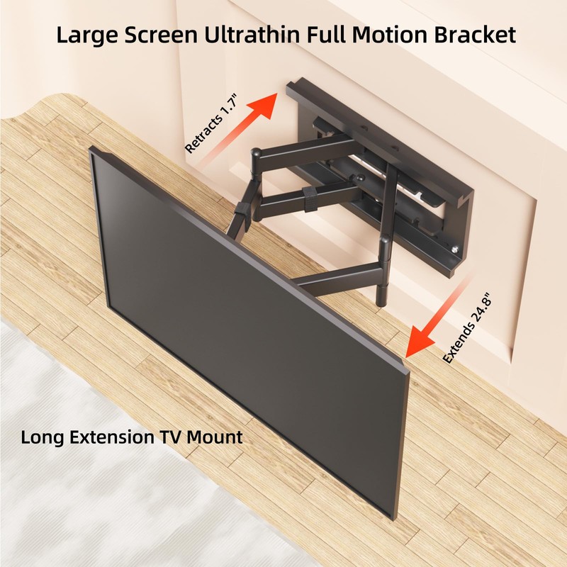 - Flexibility,Full motion,Comfortable: The Ultra Slim full motion TV wall mount is fully adjustable to your comfortable viewing angle for a high quality viewing experience,swivels +/-60°without tools ,tilts 0°~+5° to reduce glare,Leveling +/-3°,extends up to 24.8 inches and retracts to 1.7 inches can both adjust the viewing distance and save space