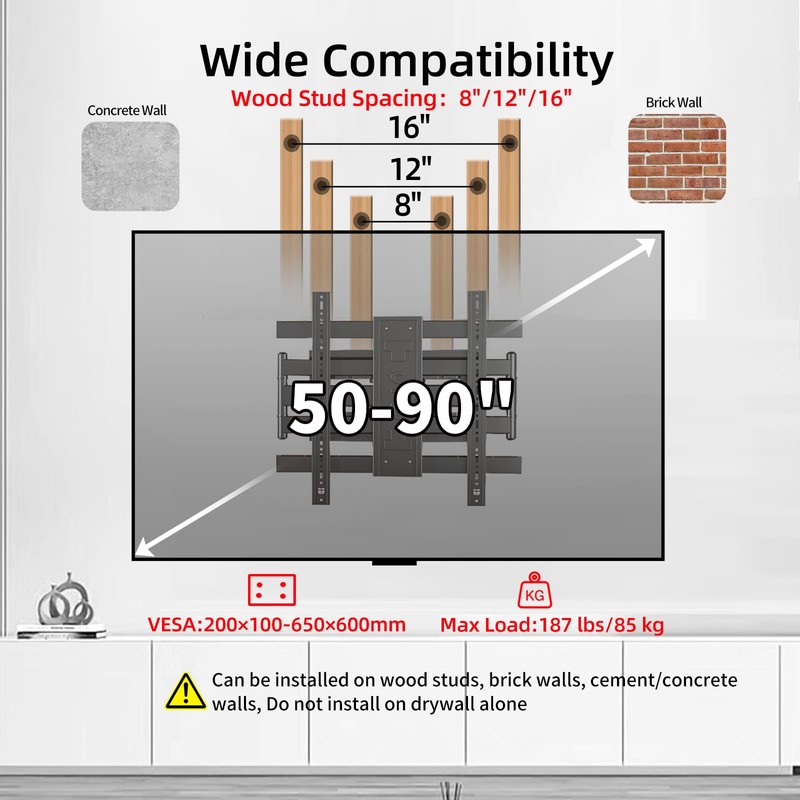 - Wide Compatible: The Universal TV Wall Mount is specially designed to fit almost flat and curved 50-90" Large TVs up to 187 LBS,with VESA patterns 200x100 to 650x600mm;VESA Patterns include 200x100mm 200x200mm 200x300mm 300x200mm 300x300mm 300x400mm 400x400mm 400x500mm 500x400mm 500x500mm 600x400mm 600x500mm, 600x600mm,650x600mm