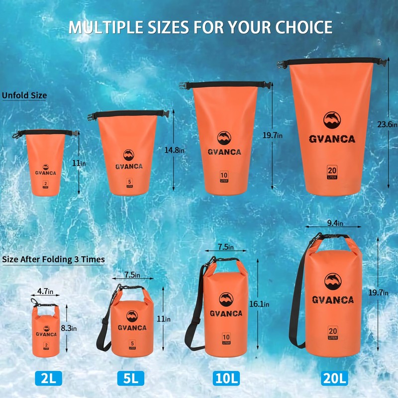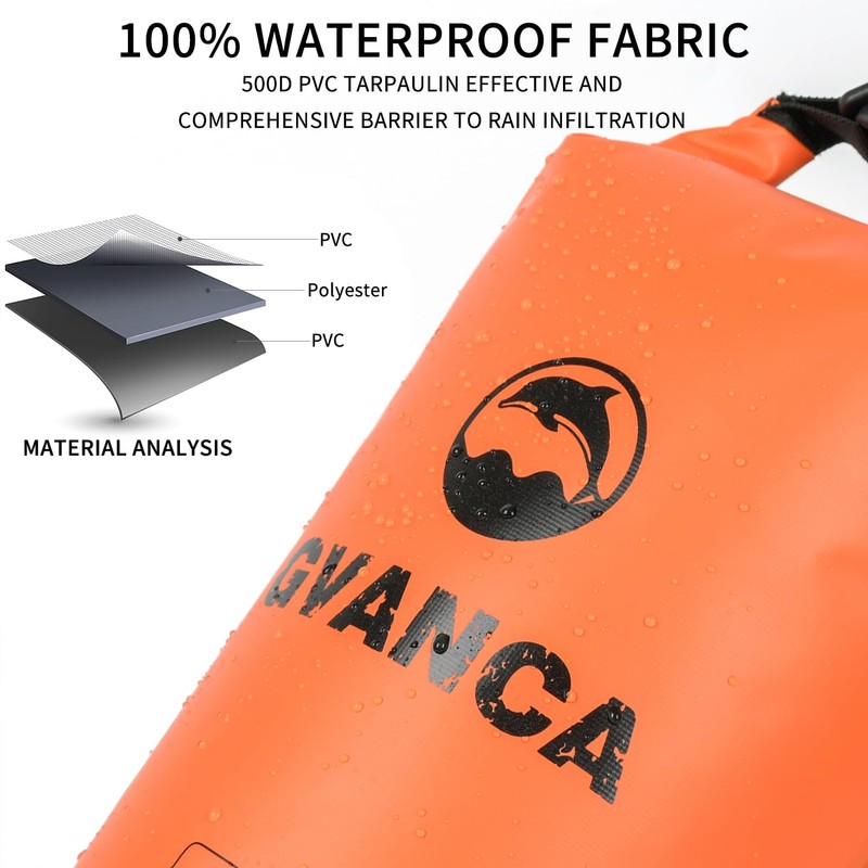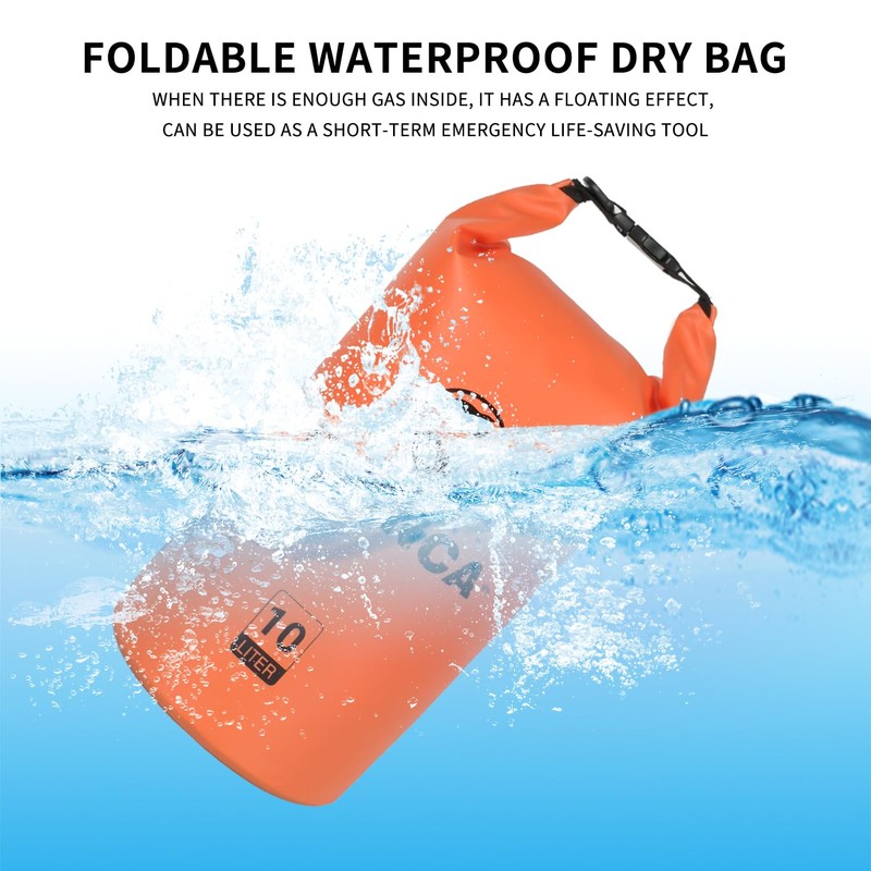 • Waterproof Protection: Crafted from high-quality 500D PVC and featuring a roll-top closure, our waterproof marine dry bags keep all your gear completely dry and safe during any outdoor activity. Whether you're on the mountains or at the beach, they will become your most trusted companions for water sports
