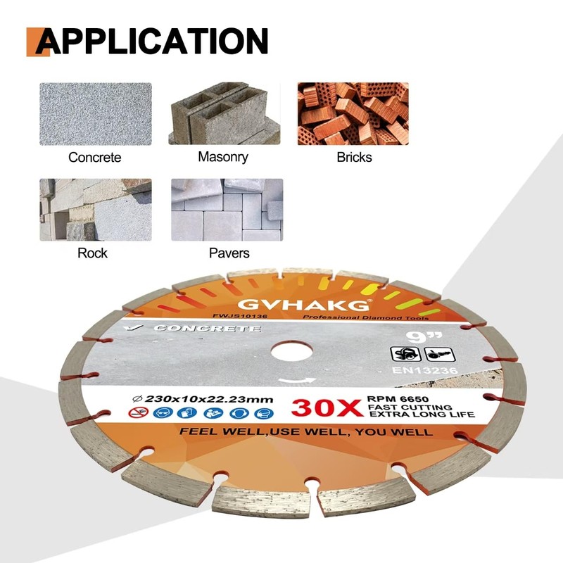 • Application: GVHAKG 230 mm diamond cutting disc can be used for wet and dry cutting concrete, brick, block, stone, brick and stone material