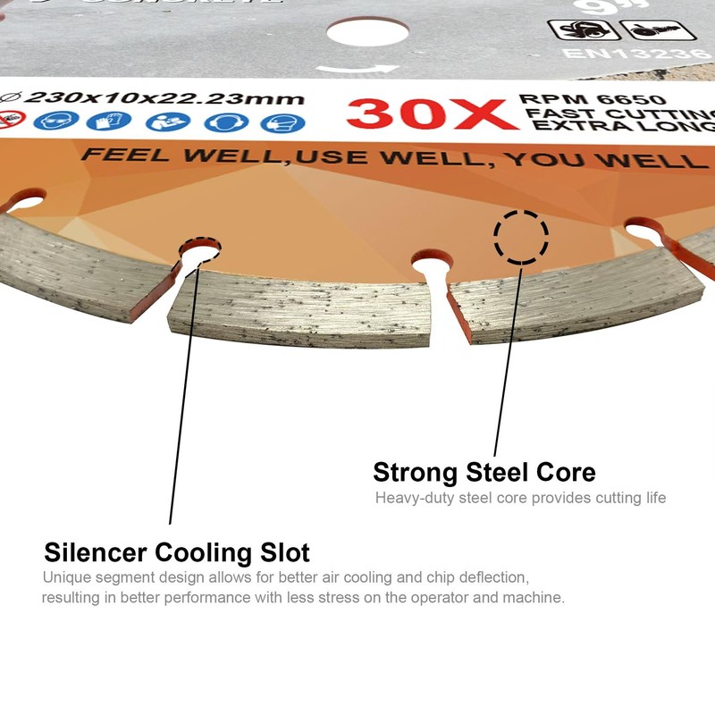 • Unique design: 9 inch blade unique segment design allows for better air cooling and chip deflection, resulting in better performance with less stress on the operator and machine