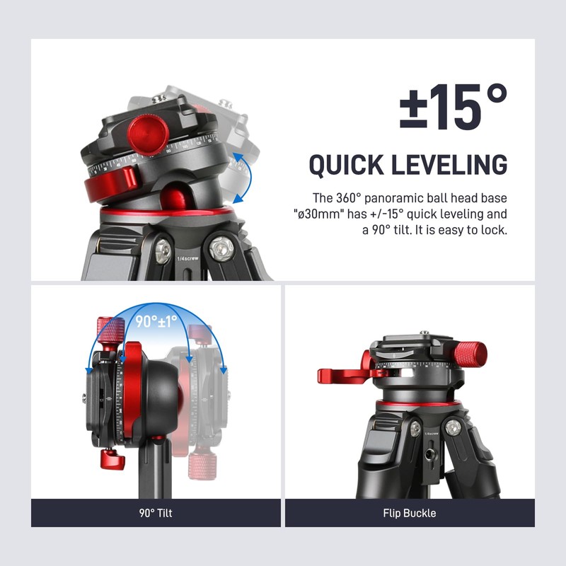 • Detachable Versatile Quick Leveling Ball Head: The 360° panoramic ball head base features quick leveling, easily lockable with a flip buckle. It includes a 1/4" to 3/8" screw adapter and a tripod camera mounting base adapter that can be attached to the center axis, allowing for interchangeable use with other tripod heads. A bubble level lets you keep the camera straight.