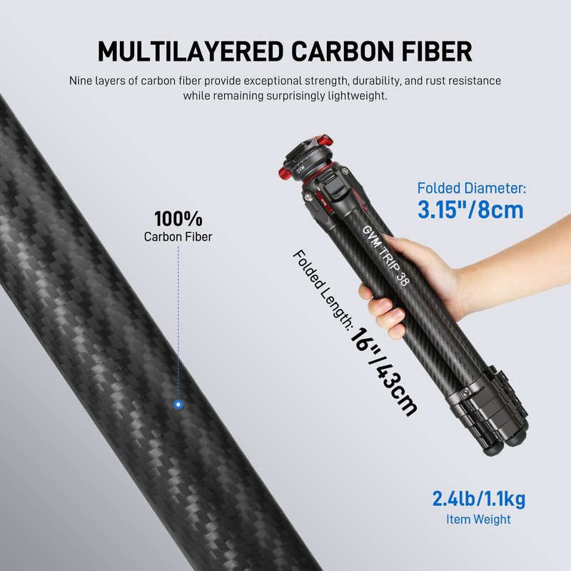 • Compact, Lightweight, but Stable Travel Tripod: Crafted from carbon fiber, this GVM TRIP-38 compact camera tripod weighs only 2.42lb (1.1kg) but enhances its maximum load capacity to 22lb (10kg), even with all-metal height adjustment buckles and nonslip rubber feet for added stability. Tightly fitted legs fold down to a handheld diameter of 2.6"/6.5cm and a compact folded length of 16"/42cm, with a storage bag for easy portability.