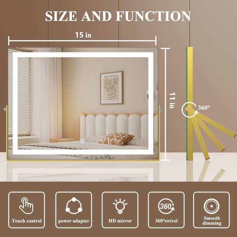 Gvnkvn Vanity Mirror with Lights, 15"× 11" LED Makeup Mirror, Lighted Makeup Mirror with Lights, Smart Touch Control Dimmable 3 Modes Light 360°Rotation Gold