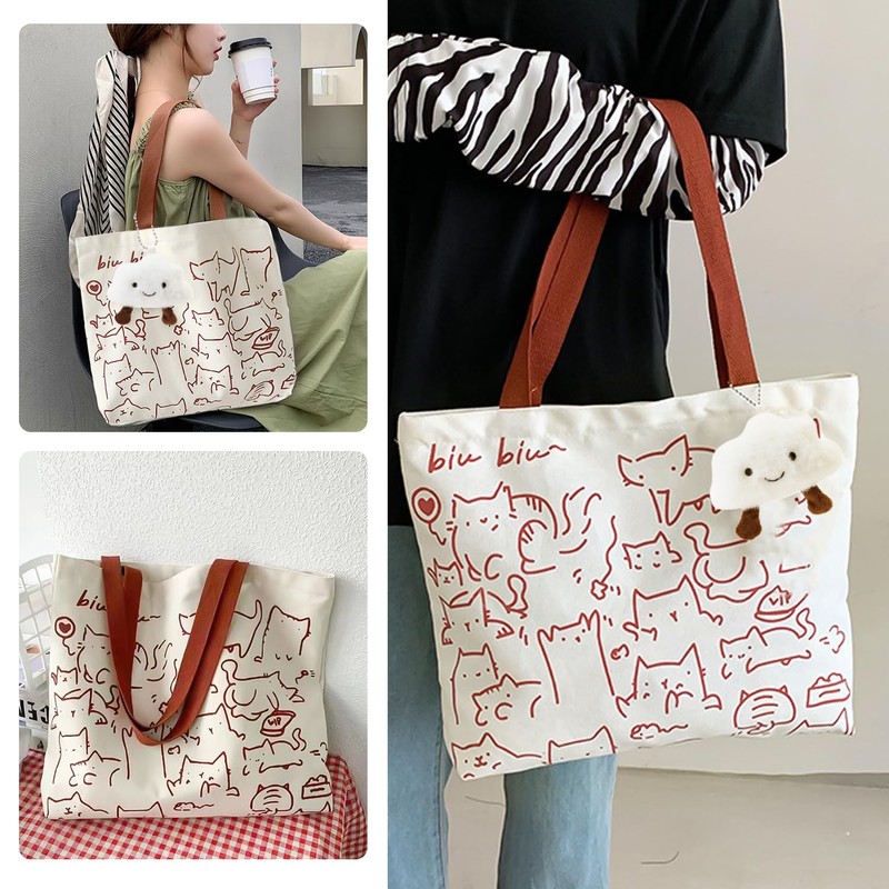 GVSAVY 1 canvas tote bag with 1 plush cloud pendant, large capacity shoulder bag, cute tote bag, cat pattern shopping bag, foldable leisure bag, suitable for travel, picnic, shopping