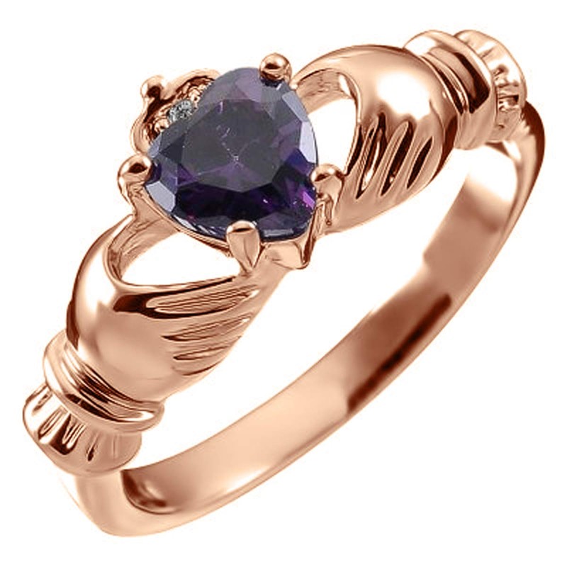 GWG Jewellery 18K Rose Gold Coated Claddagh Love Ring with Amethyst Purple Heart Stone, Hands, and Crown – 5 in Gift Box for Women