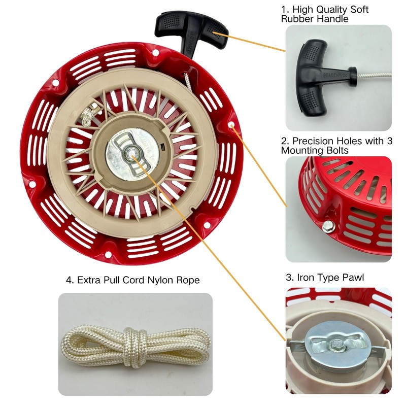 - The recoil pull starter assembly features a red iron plate pawl. It comes with an OEM nylon 66 rope that is compatible with Honda starter cords.