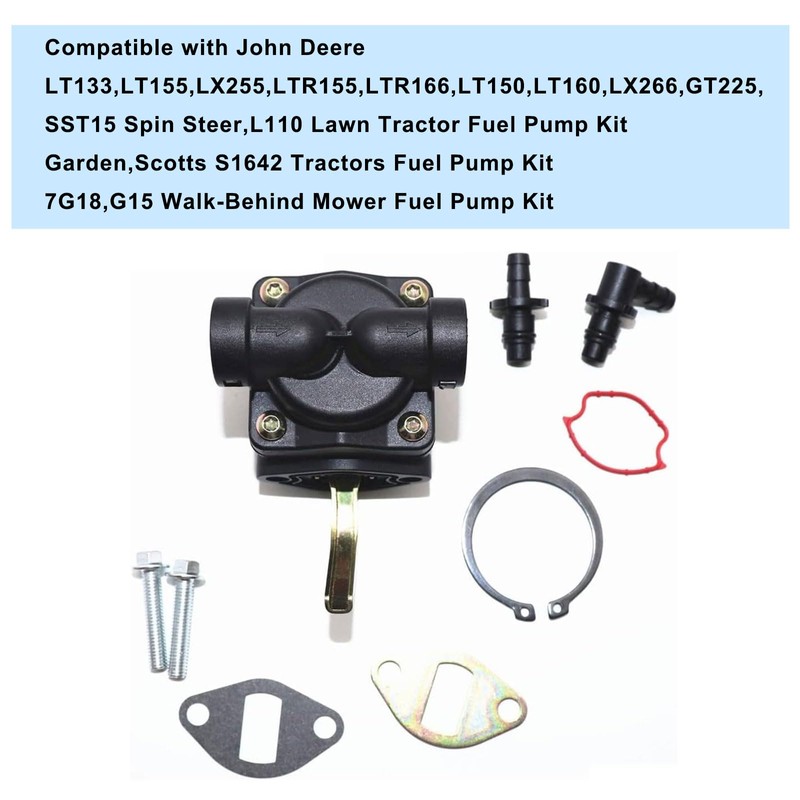 • Fitment-3: Compatible with John Deere LT133, LT155, LX255, LTR155, LTR166, LT150, LT160, LX266, GT225, SST15 Spin Steer, L110 Lawn Tractor Fuel Pump Kit; Garden, Scotts S1642 Tractors Fuel Pump Kit; 7G18, G15 Walk-Behind Mower Fuel Pump Kit