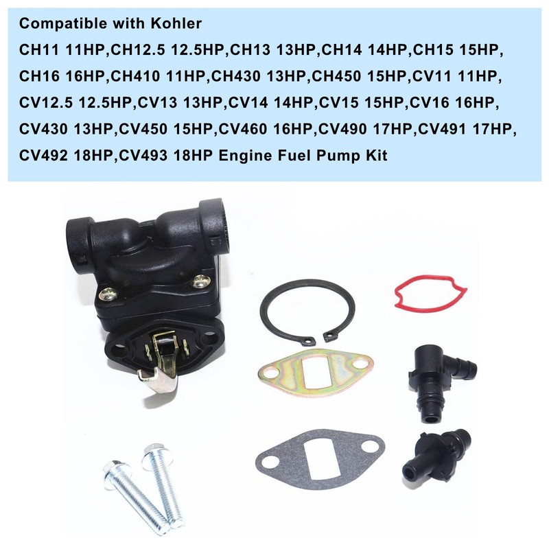 • Fitment-1: Compatible with Kohler CH11 11HP, CH12.5 12.5HP, CH13 13HP, CH14 14HP, CH15 15HP, CH16 16HP, CH410 11HP, CH430 13HP, CH450 15HP, CV11 11HP, CV12.5 12.5HP, CV13 13HP, CV14 14HP, CV15 15HP, CV16 16HP, CV430 13HP, CV450 15HP, CV460 16HP, CV490 17HP, CV491 17HP, CV492 18HP, CV493 18HP Engine Fuel Pump Kit