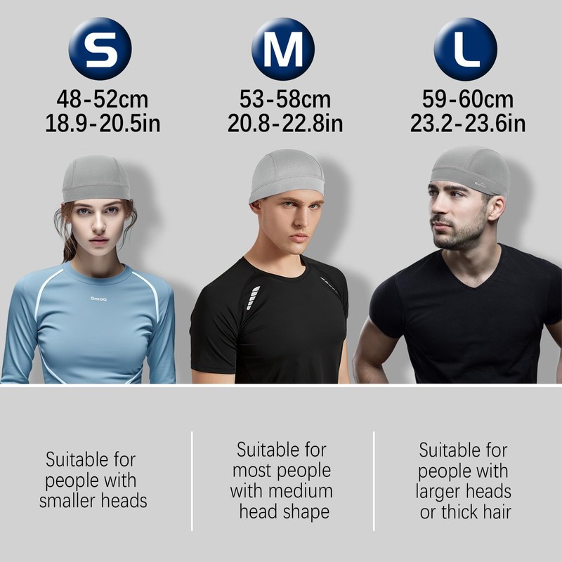 - [3-Size Flexibility | 50-66cm Head-Fit Skull Caps] Available in S/M/L sizes, these skull caps with memory-stretch fabric adapt to 50-66cm head sizes. The tension-controlled design locks securely during intense movements while eliminating pressure lines, ensuring perfect fit for individuals with varying head circumferences.