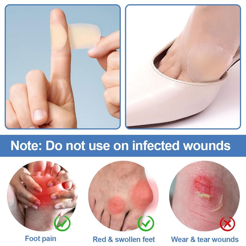 - Weiches und ultra-bequemes Design - Das ultraleichte Hydrokolloid-Material bietet eine weiche, bequeme Passform, die Feuchtigkeit absorbiert und gleichzeitig Ihre Haut vor Reibung und Stress schützt. Es eignet sich hervorragend, um Blasen zu vermeiden, die durch neue Schuhe, Absätze, Stiefel oder Turnschuhe verursacht werden.