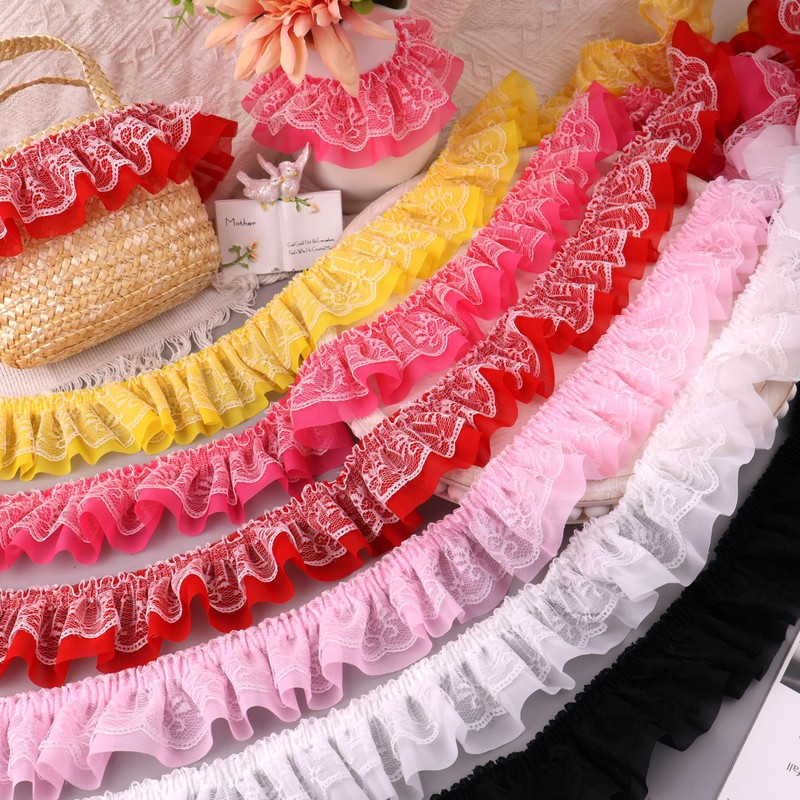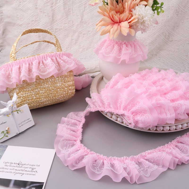 GXTIZAS Lace Ruffle Ribbon Double-Layer Pleated Chiffon 6cm Wide Lace Elastic Trim Wrinkle-Free Boxed for DIY Sewing, Clothing, Pillowcase Decoration(5yards Pink)
