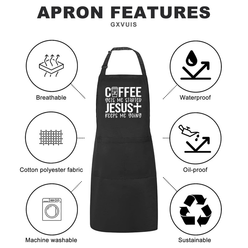 GXVUIS Coffee Gets Me Started Jesus Keeps Me Going Women Apron with 2 Pocket Waterproof Adjustable Bib Apron Christian Gift Black