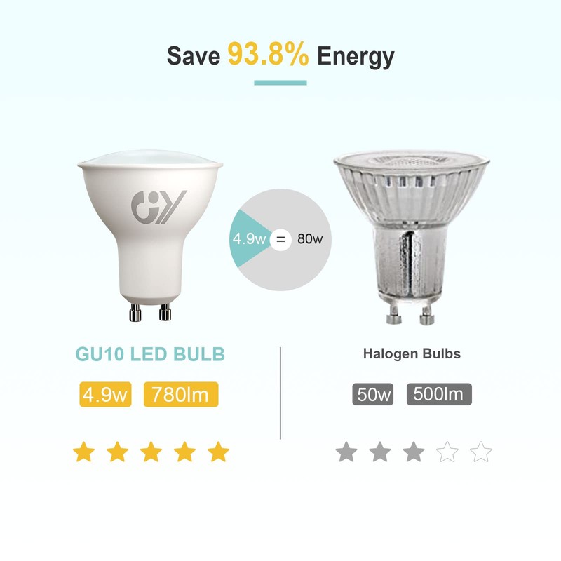 - More energy-efficient LED bulbs: GY GU10 LED bulbs are class B energy efficient, far better than other EF energy-efficient bulbs, with a power of 4.9 W, more than conventional bulbs 5 W/6 W/7 W/8 W, replace 80 W halogen bulbs, save up to 93.8% of the cost of electric lighting. According to calculation comparison, the 80 W halogen bulb can only last 12.5 hours for a degree of power consumption, while the GY 4.9 W LED GU10 can last 204 hours.
