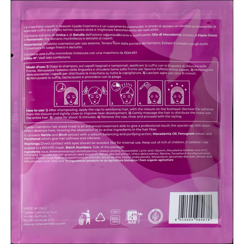 The sheet mask provides all hair types with professional care. Its formula contains balancing and clarifying extracts obtained from nettle and birch which are optimally absorbed by the hair strands thanks to the mask's steam effect. Macadamia oil, fenugreek seed extract and panthenol boost suppleness and shine.