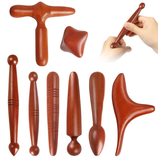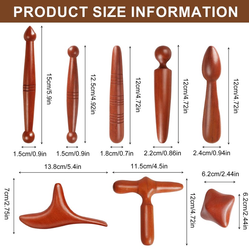- 8-piece premium set for trigger point therapy: 1 triangular tool + 5 massage sticks + 1 cross shape + 1 hexagon made of pear wood. Ideal for Trigger Point, Acupressure and Gua Sha.
