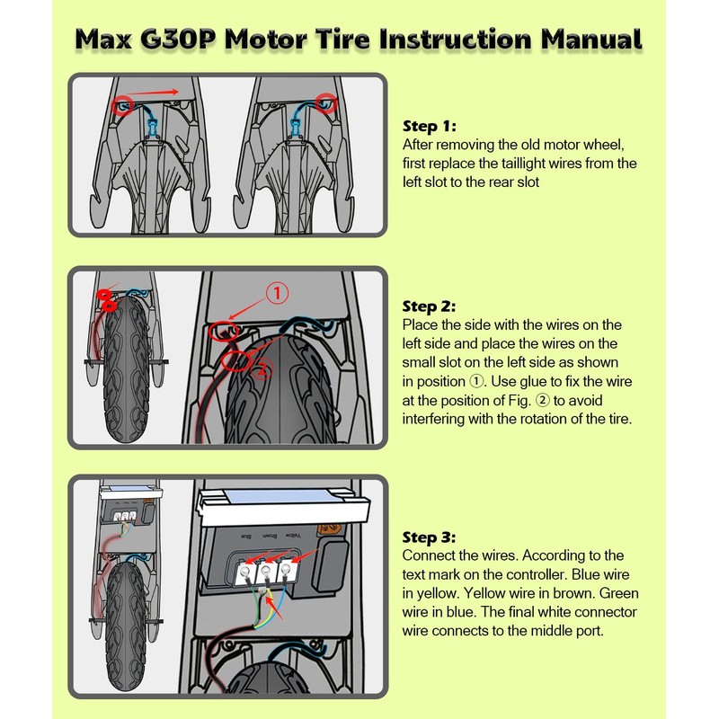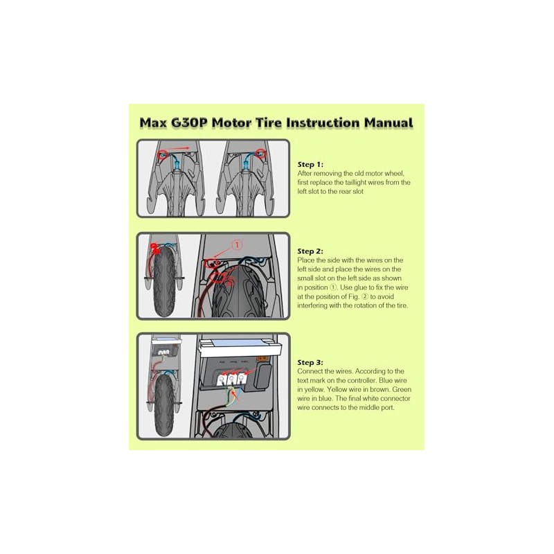 - Installation: If you install it and find that the motor wheel does not work properly, please leave us a message and we will determine the problem for you and provide installation assistance. Any problem can be solved. Please note that the mounting is not the same as the original motor wheel, and the wire colors are blue, yellow, and green in order from left to right.