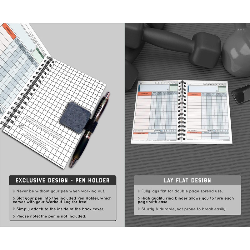 Take control of your workout with our premium diaries. Our fitness journals have an unusual approach to fitness and workout tracking. We leave it to you to set your goals and have created a simple template to help you achieve them. We pride ourselves on sourcing and using only the best materials for our products - from recycled paper to offset ring binders - you can use these gym journals without guilt as they are environmentally friendly. What distinguishes our gym diaries? All of our fitness journals come with a faux leather pen holder (vegan) so you never have to carry a separate pen at the gym. Just put it in your fitness journal and you're ready to go. Once you've had a fitness journal with a pen holder, you'll wonder how to finish without. All of our fitness journals are printed in full color, making your fitness journal appealing to use and easier to read.