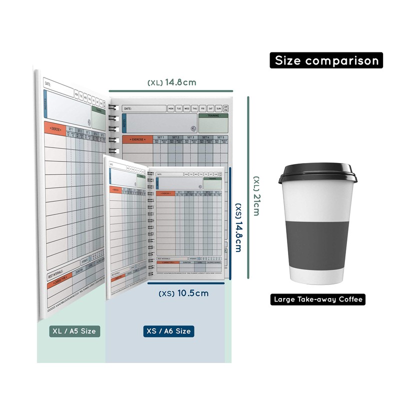 • CHOOSE YOUR SIZE - Unlike other workout protocols, all of our fitness journals are available in XL and XS sizes - so you can choose what works best for you. Even our smallest journal has more writing space than the competitors. No need for small handwriting in none of these fitness journals.