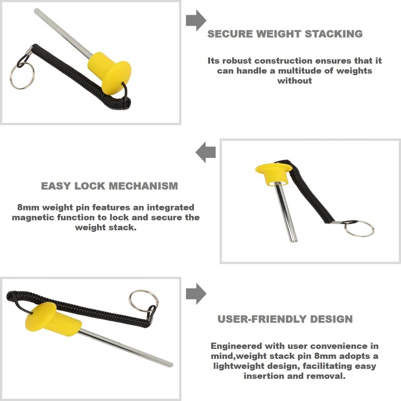- USER-FRIENDLY DESIGN:Engineered with user convenience in mind,weight stack pin 8mm adopts a lightweight design, facilitating easy insertion and removal. This thoughtful design makes the pin a convenient tool for daily use, expediting the process of changing weights during your workout.