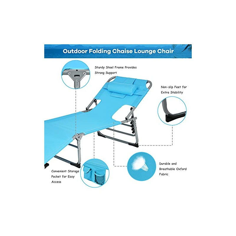 GYMAX GYMAX Tanning Chair, Folding Beach Lounger with Face Arm Hole, Adjustable Backrest, Side Pocket, Pillow & Carry Handle, Outside Sunbathing Lounge Chair for Patio, Poolside (1, Turquoise)