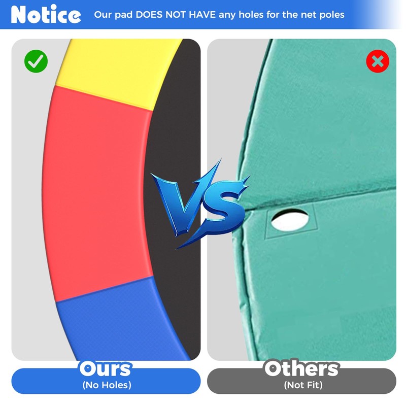 - Safe Jumping: Our trampoline pad fully covers springs to protect your feet from being pinched. Unlike others’ pads with holes (not fit), ours’ pad (with no holes for poles) fits closely over the springs, minimizing the risk of accidents.