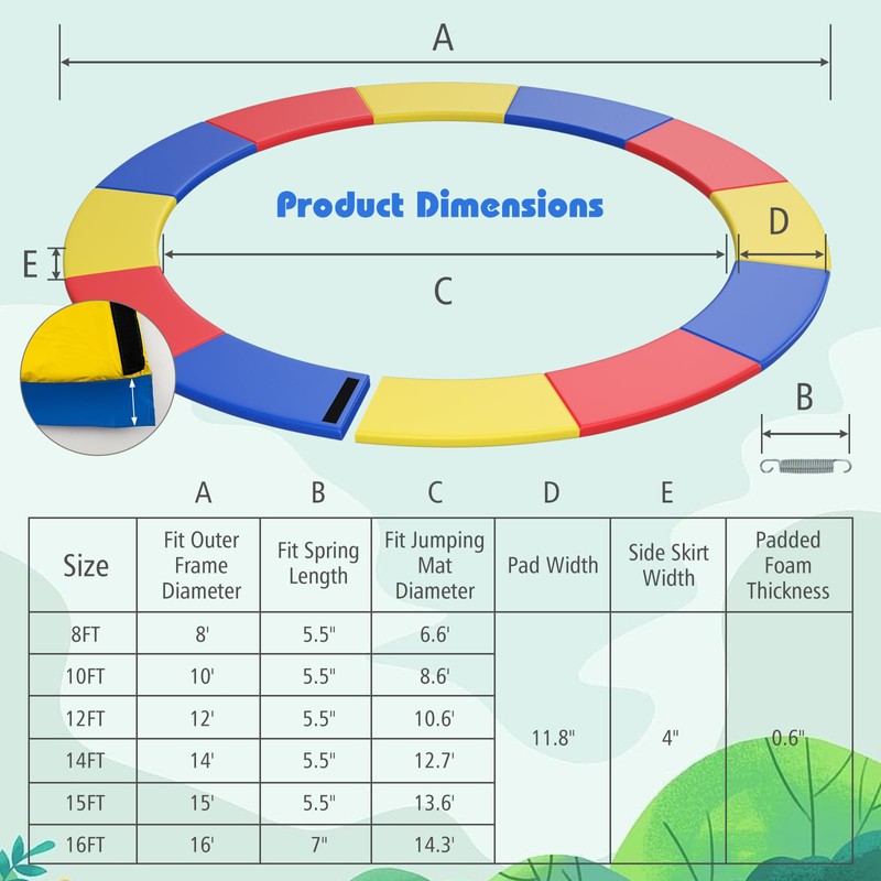 - Universal Sizes to Choose: We have universal sized trampoline pad to fit various trampoline dimensions: 8FT/10FT/12FT/14FT/15FT/16FT. Before purchasing trampoline replacement pad, please measure the overall diameter of your trampoline frame.