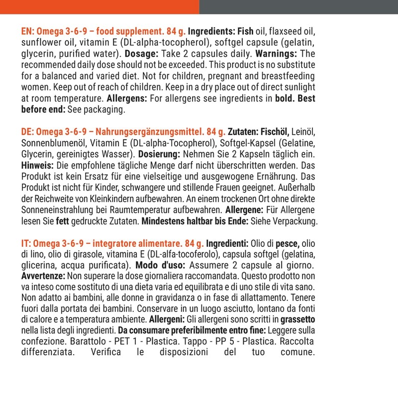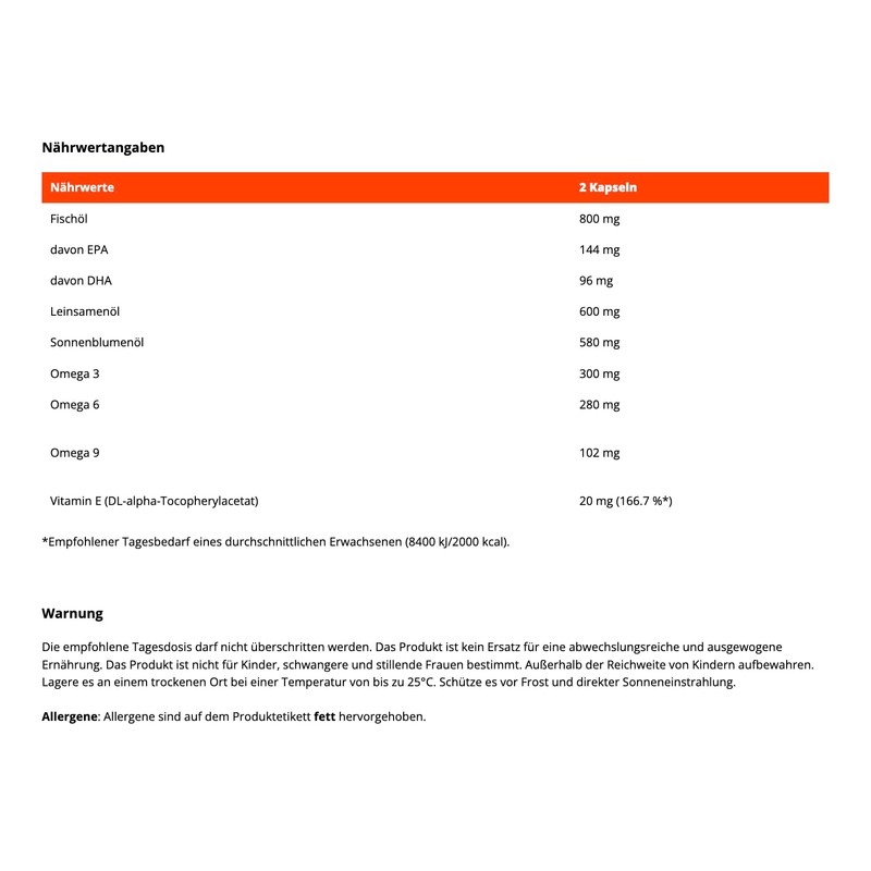 - Einzigartige ?lkombination: Genie?e die Vorteile von Fisch-, Leinsamen- und Sonnenblumen?l in unserem Omega 3-6-9. Jede Kapsel enth?lt 800 mg Fisch?l, 600 mg Lein?l und 580 mg Sonnenblumen?l.