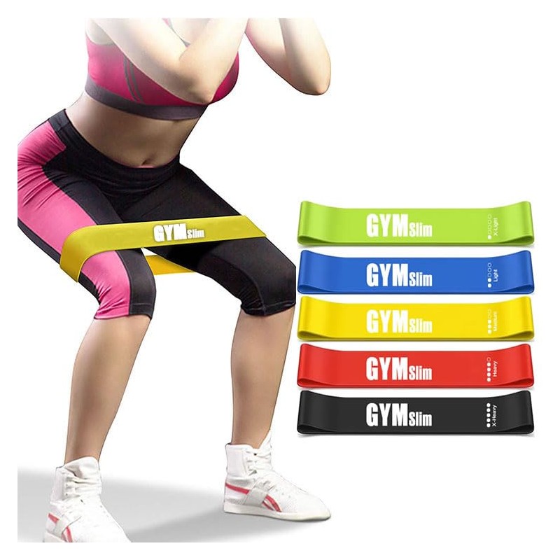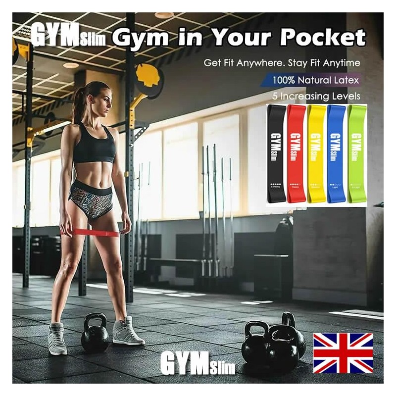 - 💪 GYMslim Resistance Bands Offer 5 Different levels of tension in 5 different colours, ideal for Home or Gym Workouts Targeting areas of the body, Fitness, Toning, Exercise, Strength, Therapy.