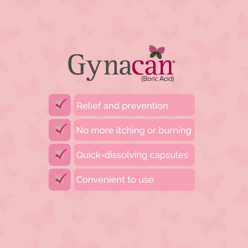 - CONVENIENT TO USE, NO MESS, VEGAN SUPPOSITORIES: GYNACAN is an over the counter 100% pharmaceutical grade boric acid formulation that helps relieve recurrent vaginal infections and vaginal discomfort quickly and efficiently. Our vaginal Vegicaps contain 600 mg of boric acid.