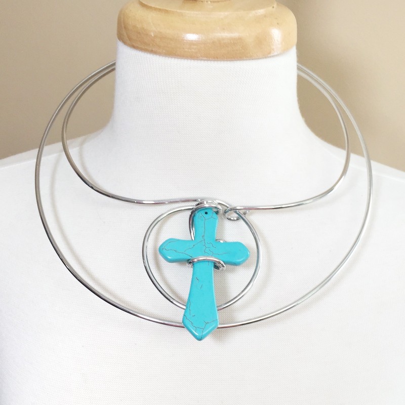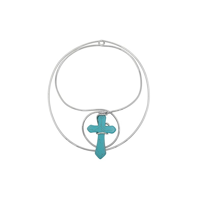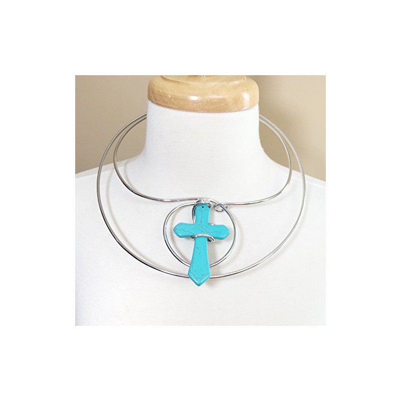 Gypsy Jewels Large Simulated Turquoise Cross Western Look Silver Tone Bib Statement Necklace (Open Bent Wire)