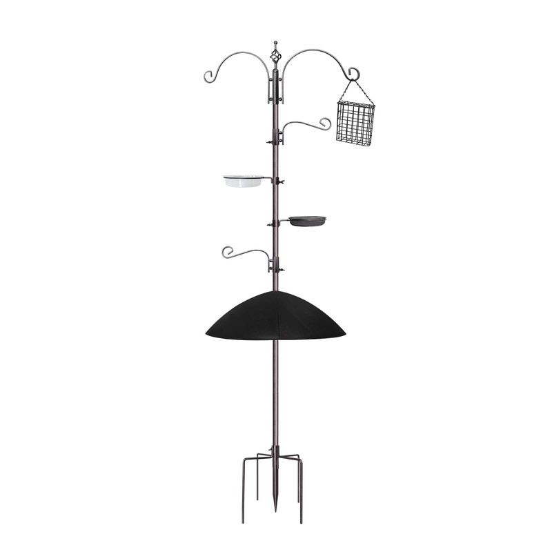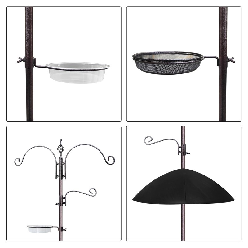 - HIGH-QUALITY BIRD FEEDING STATION KIT: The bird feeding pole includes a plurality of hooks, and there are also trays for food and water, squirrel baffles and a sheep fat feeder for convenient feeding. The hooks can be used to hang bird feeders of different sizes, which can effectively attract birds, and the squirrel baffles can prevent birds from being eaten by squirrels