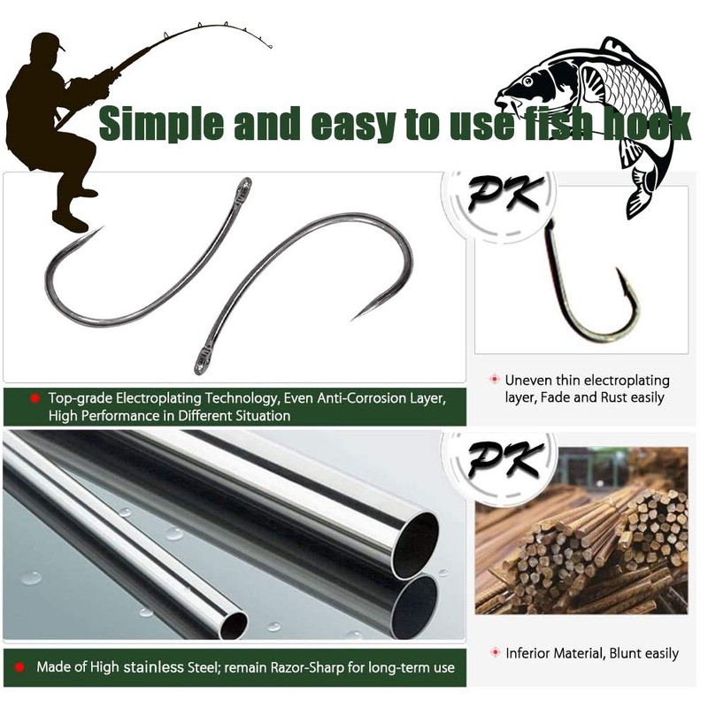 - High quality carp hooks: fishing hooks with curved shaft are made of stainless steel, rust-proof, durable and strong in load capacity can work for a long time. Strong and sharp hooks usually hold securely in the lip of the fish. This makes it difficult for the fish to spit the hook again.