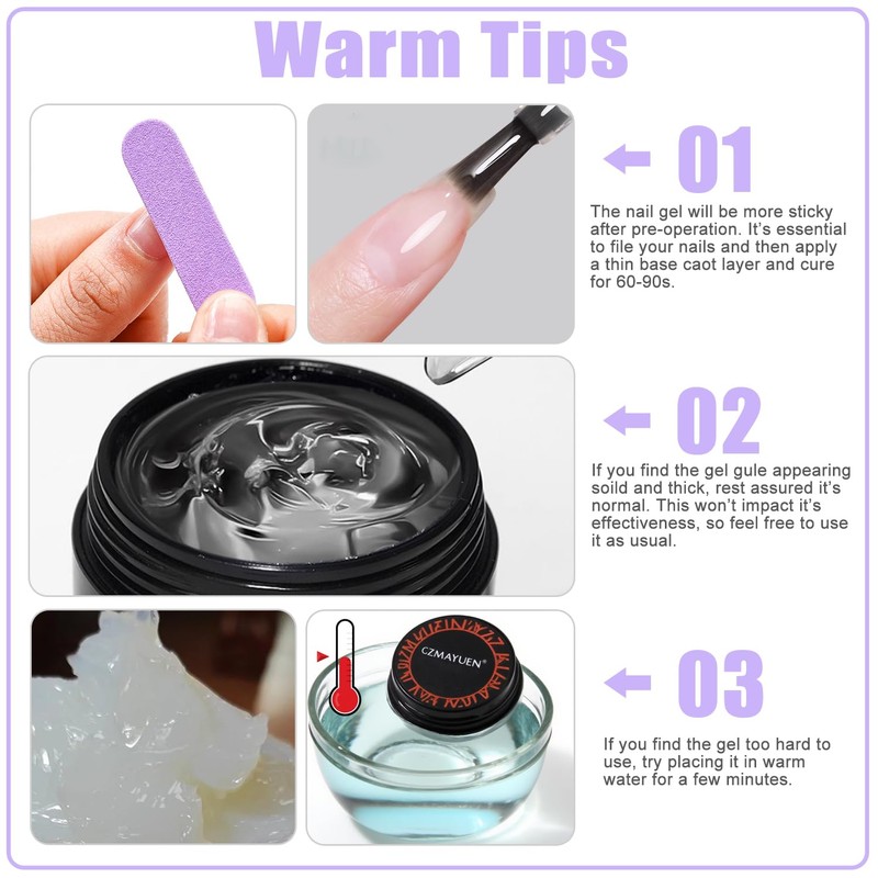 - Warm Tips This gel is firm and looks hard at normal temperature, while the low temperature makes it harder and high temperatures make it sticky than usual. You can seal it in warm water for a while or refrigerate to make it suitable for use. A beautiful nail preparation will last longer. So be sure to remove the shine of your natural nail plates before applying the gel.