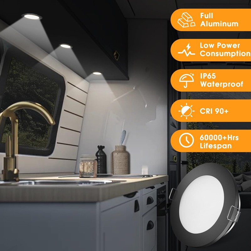- Diseño delgado: luces interiores de RV de grosor agradable de solo 1,27 cm, ligeras y compactas para lugares estrechos como RV, barco, camión, techo de furgoneta, etc