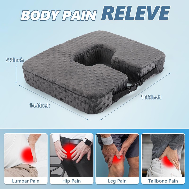 - Innovative DesignThe new donut pillow style has a scientific center hole and coccyx cutout, which can evenly distribute weight and reduce hip pressure. It is more effective in relieving pain than traditional seat cushions and hemorrhoid pillows.