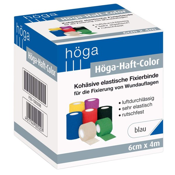 ProduktbeschreibungH?ga-Haft-Color blau 6cm x 4m gedehnt, koh?sive (selbsthaftende) Fixierbinde f1r die Fixierung von Wundauflagen, luftdurchl?ssig - sehr elastisch - rutschfest,; Material: 72% Baumwolle, 28% Polyamid mit Latexbeschichtung, Dehnung ca. 80%; Luftdurchl?ssig, rutschfest, sterilisierbar mit EO; Beschichtung: Naturlatex; Lieferbare Breiten: 4, 6, 8 ,10cm. Lieferbare L?ngen: 4, 20m gedehnt.Inhaltsstoffe / Zutaten72% Baumwolle, 28% Polyamid mit LatexbeschichtungGebrauchsanweisungAnwendung: 1. Reinigen Sie die Wunde und Haut drumherum. 2. Legen Binde um Wunde, ohne sie einzuschn1ren. 3. Fixieren an der gew1nschten Stelle. 4. Wechseln Binde, wenn nass oder schmutzig wird. Vorsicht: Die ist sterilisierbar, aber nicht f1r Verwendung auf offener Wundauflage geeignet.
