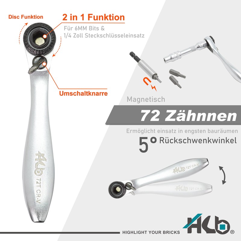 - đ§ ăMini 72-Tooth Reversible Ratchet & Magnetic Bit Holderă: 5° Arc swing, Reversible, Ratchet with disc, Dual head for 1/4" sockets & 6MM bits, Magnetic Bit Holder, Ideal for tight spaces.