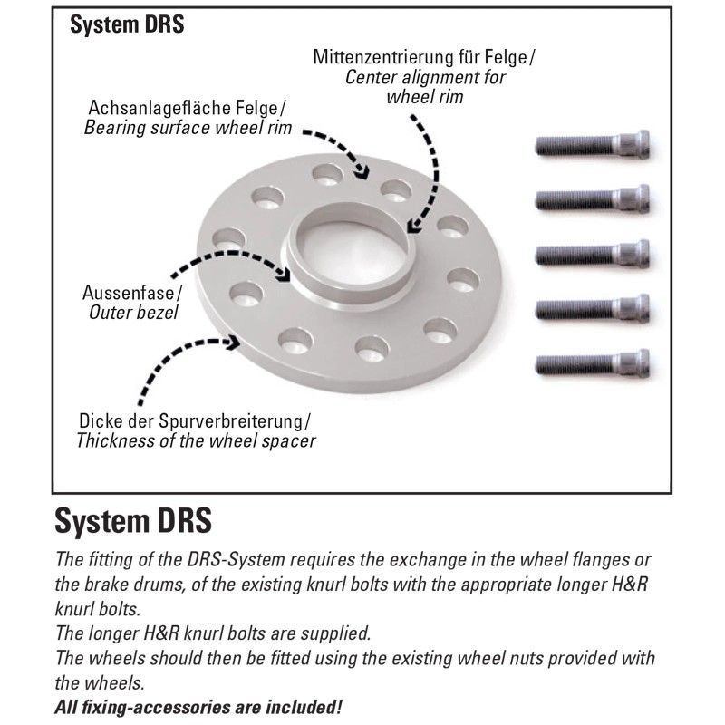 The fitting of the DRS-System requires the exchange in the wheel flanges or the brake drums, of the existing knurl bolts with the appropriate longer H&R knurl bolts. The longer H&R knurl bolts are supplied. The wheels should then be fitted using the existing wheel nuts provided with the wheels.
