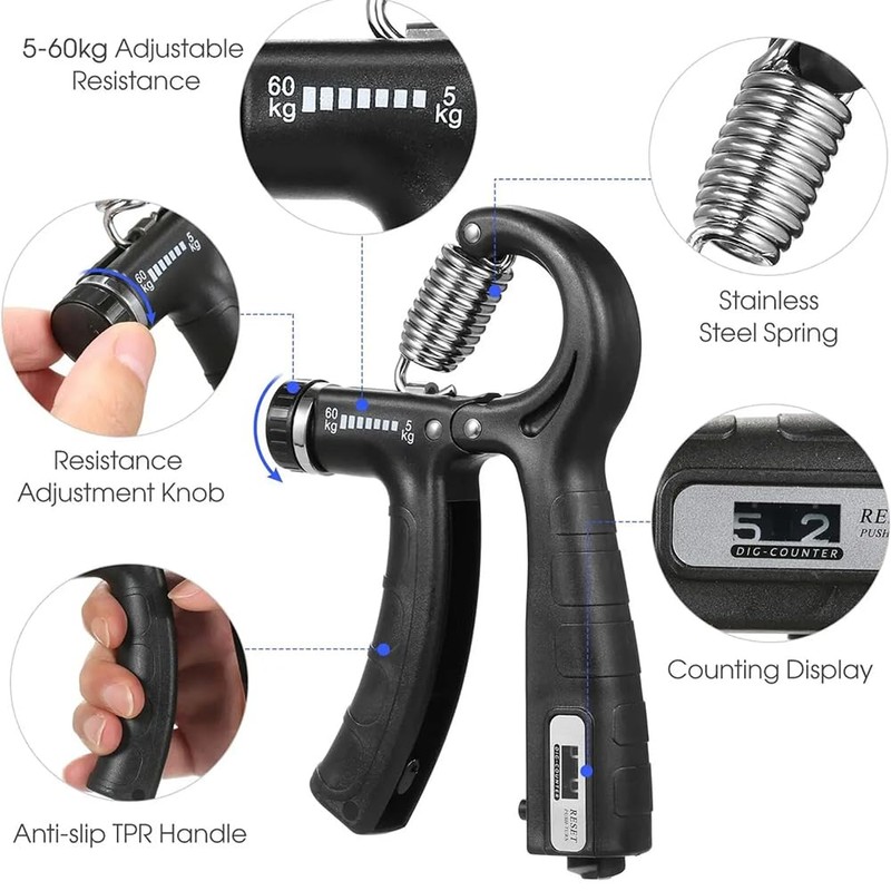 This adjustable hand grip strengthener is the perfect tool for building grip strength and forearm muscles. With its ergonomic design and comfortable grip, it allows you to perform a range of exercises with varying resistance levels from 5 kg to 60 kg. The durable construction and spring-loaded mechanism ensure a smooth and controlled workout experience. Whether you're an athlete, a rock climber, or simply looking to improve your overall hand and arm strength, this versatile device is an excellent addition to your fitness routine. Compact and portable, you can easily take it with you wherever you go, making it convenient to incorporate grip training into your daily regimen.