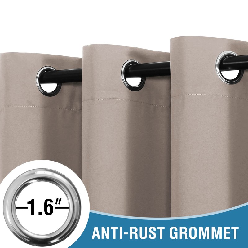 - STANDARD SIZE: Each pack contains one blackout functional curtain panel. Panel measure-100"W x 96"L(8.5'W x 8'L). Each panel has 16 anti rust grommets (rim of grommet is 2.4", while inner is 1.6"), can be hung from a basic or decorative curtain rod
