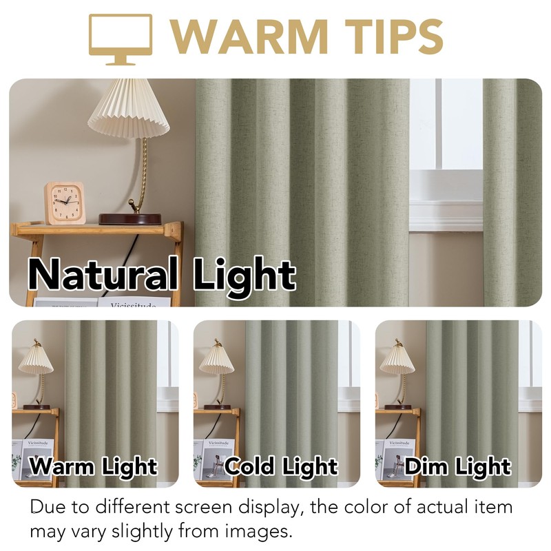 - For proper fullness, recommended purchased the panels measure 2-3 times the width of your window. This product has a natural linen composition, which gives it a slightly brownish tone. If you want to buy solid color curtains, we recommend you to choose our other products.