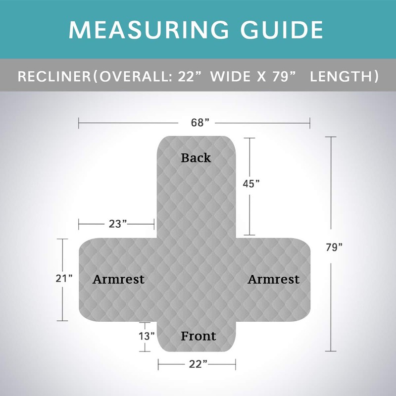 Recliner protector: Height 79'', width 68''. Includes 23'' on each side for arm rest. Total sitting area is 22''.