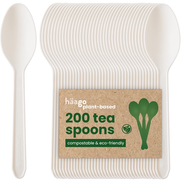 HAAGO 200 PLA Teaspoons Biodegradable Compostable Cutlery (White, 12.5cm) - Eco-Friendly Utensils for Coffee, Dessert, Ice Cream - Heavy Duty 100% All-Natural Materials
