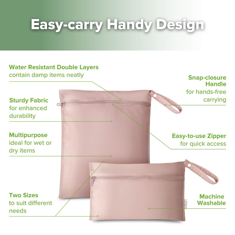 haakaa Waterproof Wet Bags for Baby, Wet Dry Bags for Diaper Bag, Travel, Swimsuit, Beach, Pool, Pump Parts, Stroller, Daycare,Yoga, Blush, 2 Pack