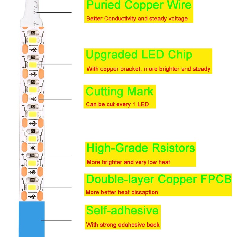 - No Heating for Perfect DIY Needs. This super bright even ligthing 2835 led strip light is non-waterproof, good for home indoor use. DC12V low voltage operations, No heating, flexiblity, slim, compact and flexible PCB strip. Mount end-to-end for bendable or angled patterns, or in continuous rows